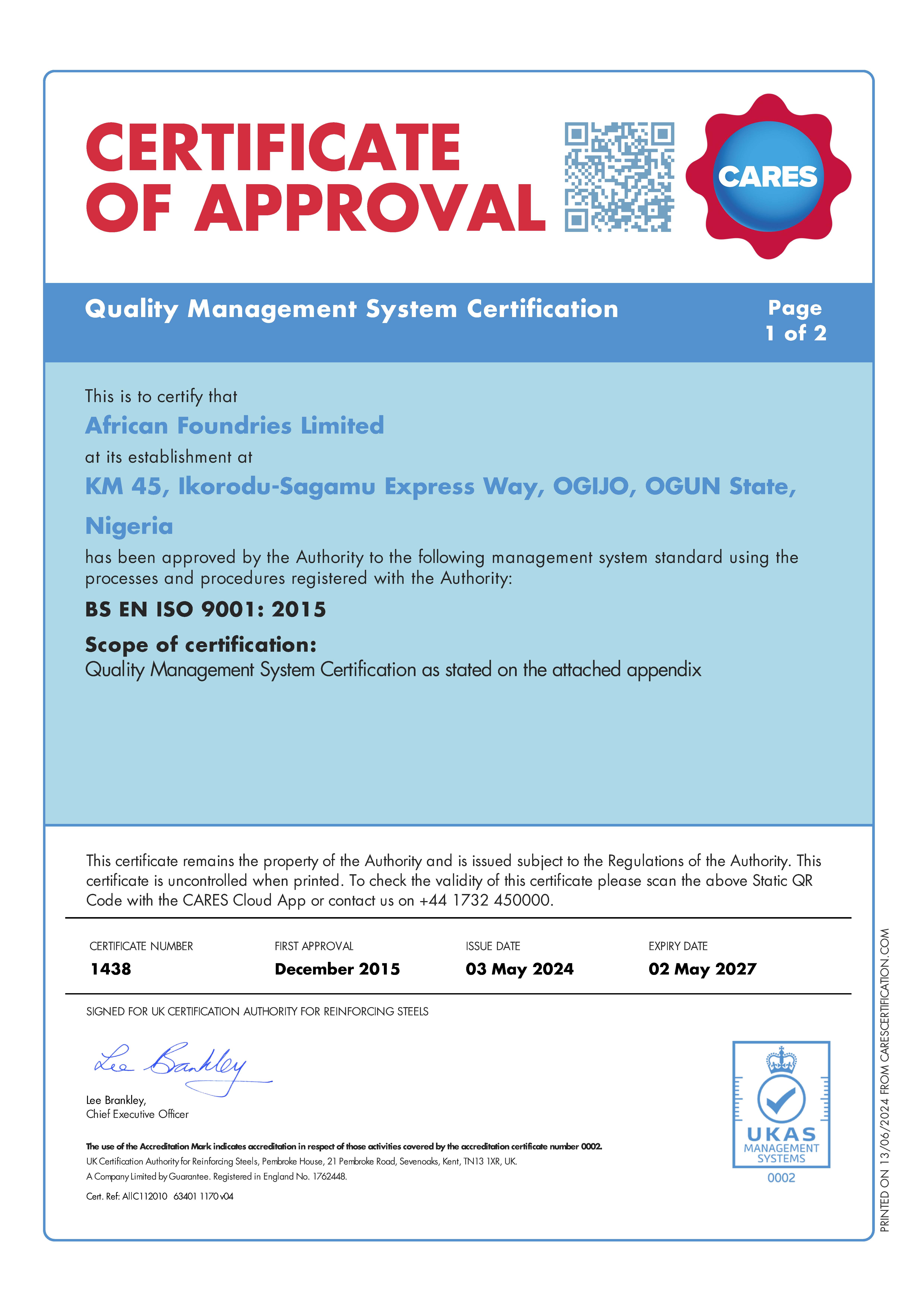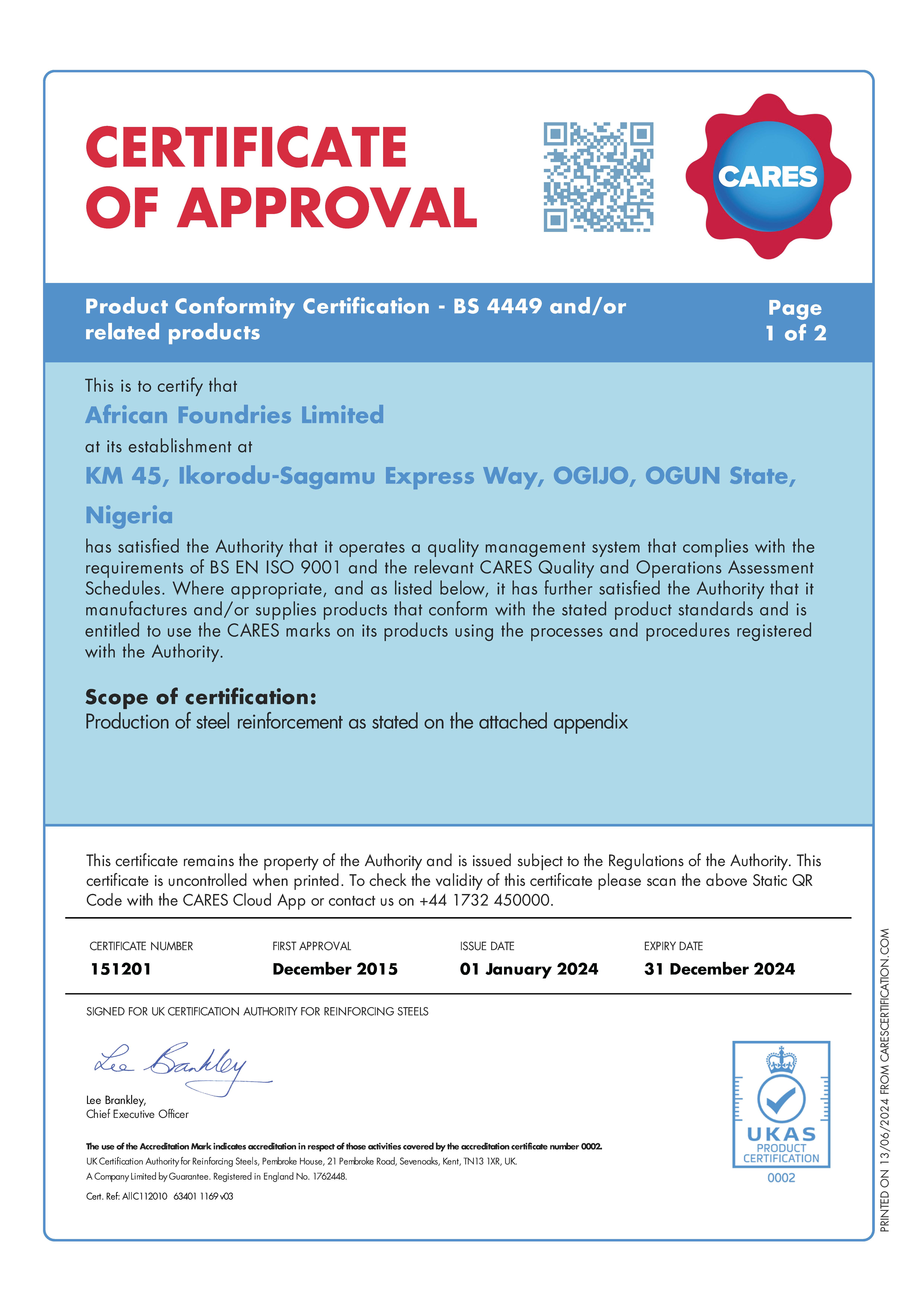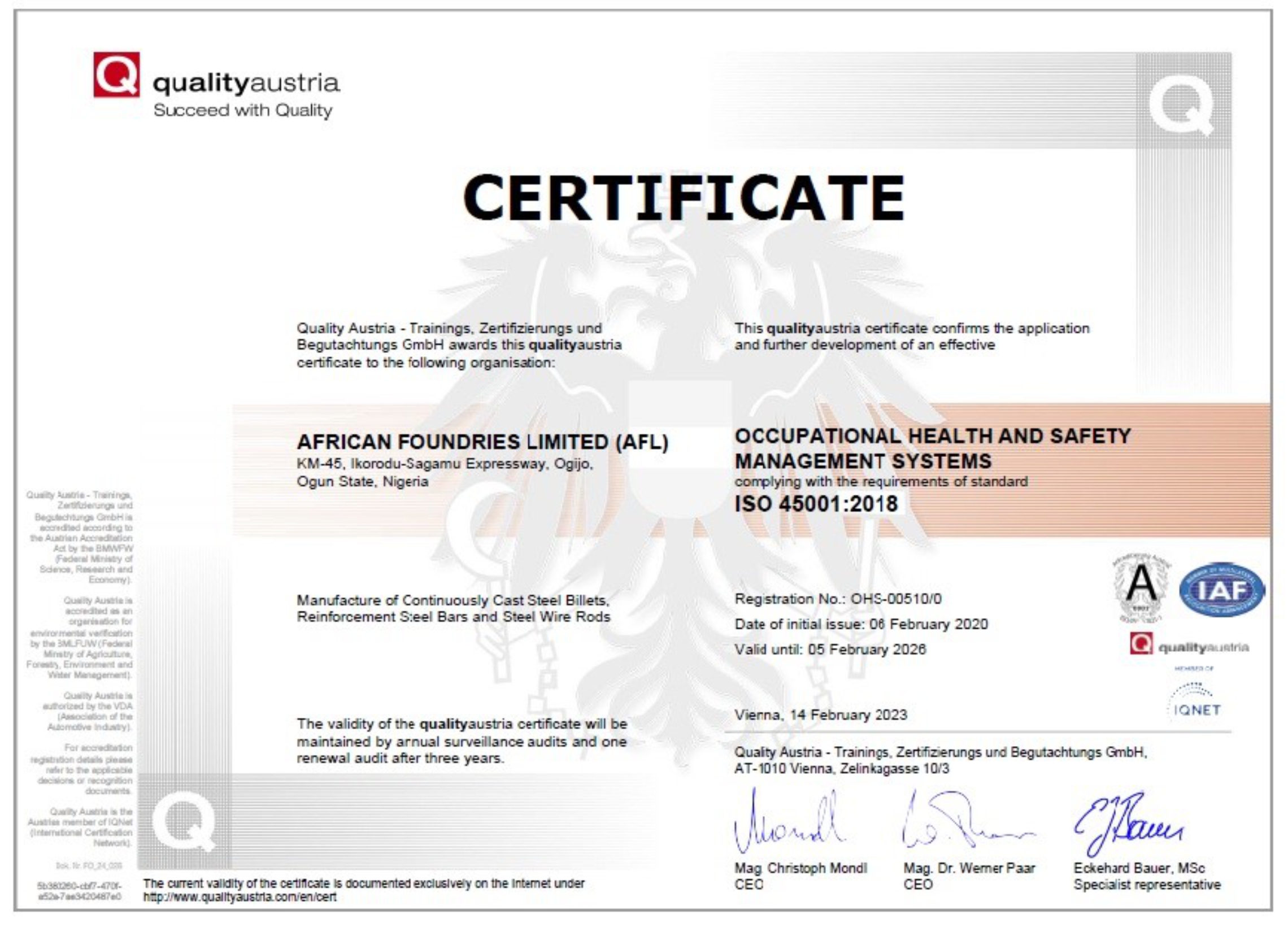 The only steel company in NIGERIA with CARES, ISO 9001, ISO 14001 and ISO 45001:2018 certifications.